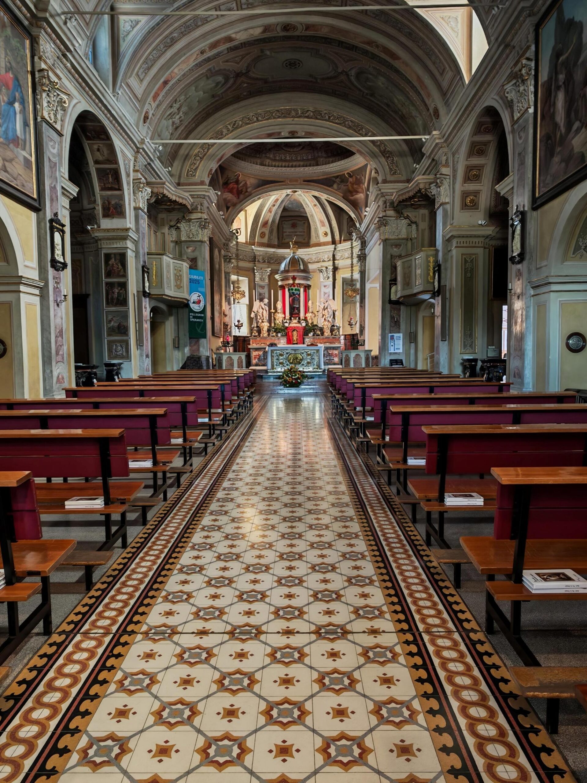 Questa Chiesa non è solo un luogo di culto, ma un diario collettivo inciso nella pietra, che ha attraversato secoli di restauri, transizioni e fermenti spirituali. Qui, la spiritualità si respira nei dettagli: negli affreschi che sorvegliano l’abside con la loro quieta maestà; nei dipinti attribuiti a Camillo Procaccini che raccontano la Natività e la Trasfigurazione come frammenti di eternità; nelle cappelle laterali che ospitano statue e immagini care alla tradizione popolare; nella vista dell’organo del 1852, costruito dalla ditta Giudici, che continua a dare voce alle liturgie, ai matrimoni, ai silenzi del raccoglimento.