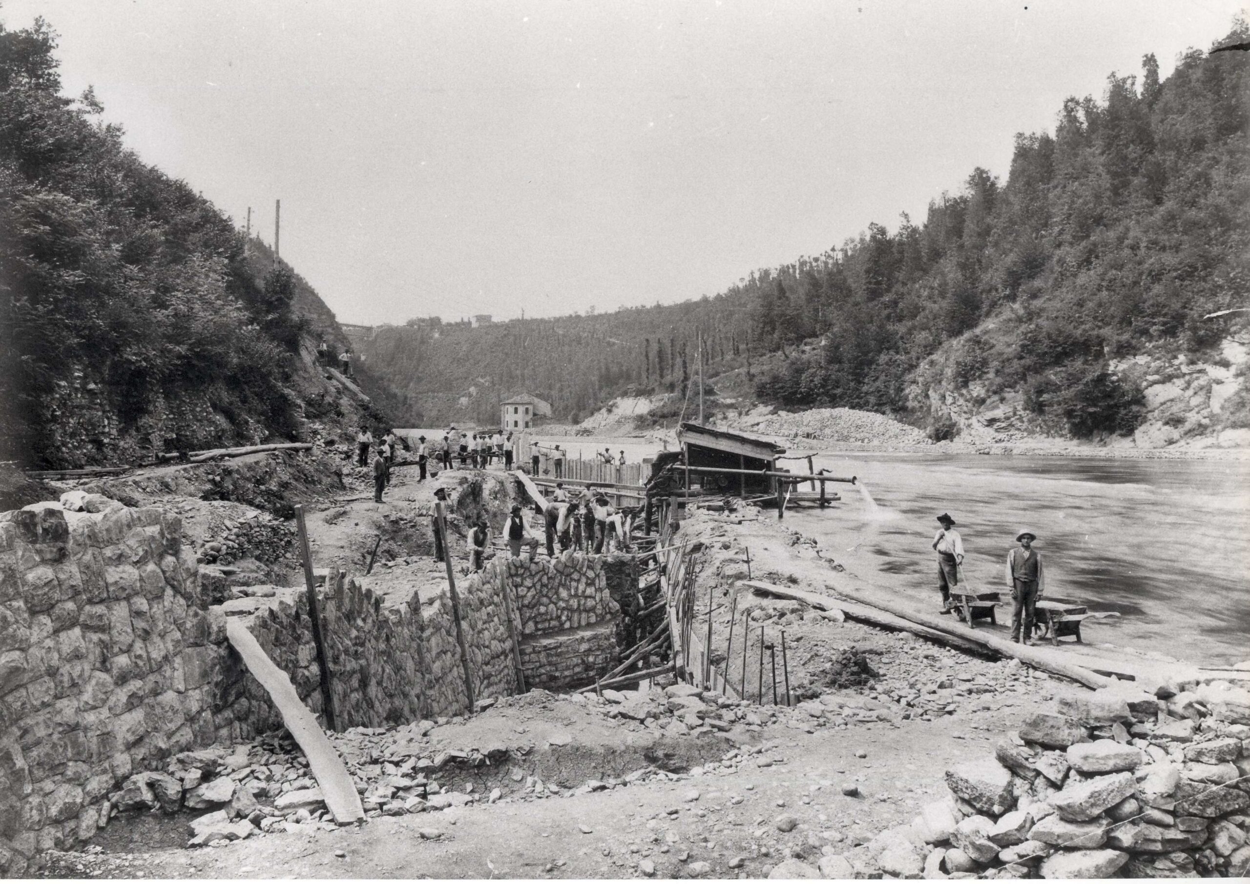 I lavori si conclusero nel 1914 e la sua imponente struttura a gravità fu dotata di cinque grandi paratoie mobili metalliche e due paratoie minori per la regolazione del livello dell'invaso, che poteva contenere fino a 2,5 milioni di metri cubi d'acqua. Dalla diga si diramarono due canali: il "Canale Edison" sulla destra, destinato all'alimentazione della centrale Esterle e parzialmente navigabile, e un canale più breve sulla sinistra.