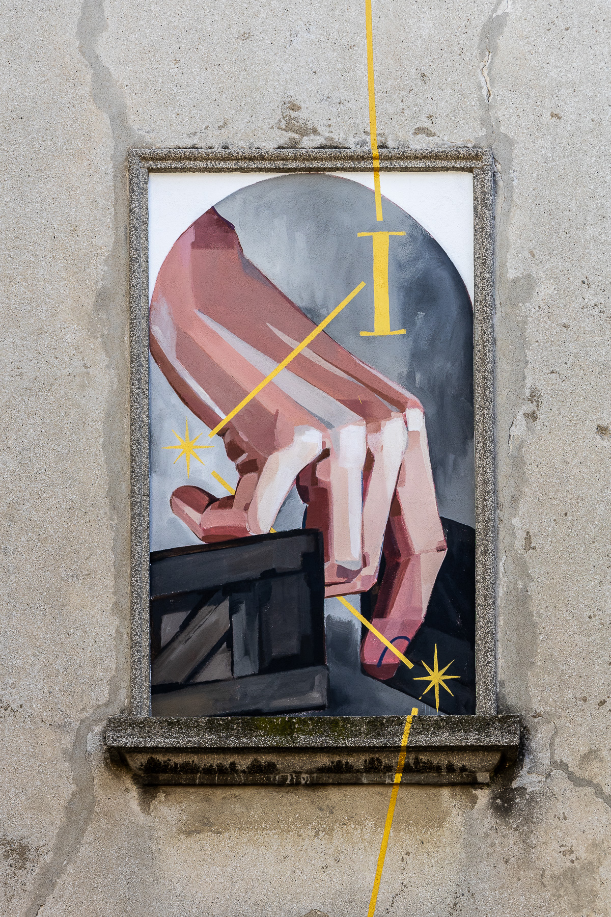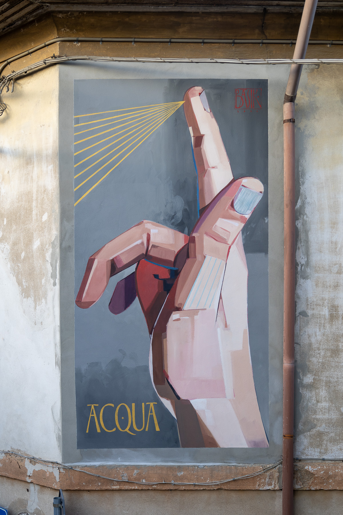 Nel secondo, TANGERE verso uno, l’artista ragiona sul ruolo del Ponte San Michele, gioiello e simbolo di Paderno d’Adda, che, poggiando su pochi ma solidi punti, ha unito luoghi distanti tra loro, diventando così possibilità, opportunità, comunicazione. Le mani dipinte da Basik raccontano la lotta tra San Michele, cui è intitolato il ponte, e il drago, che sintetizza in sé tutti gli impedimenti naturali. I tatuaggi infatti, come le decorazioni di un’anfora greco-romana, si fanno narrazione parlante, mostrando da un lato la spada del santo e dall’altro la forra dell’Adda e le sue rapide. La lotta è interrotta però da una linea d’oro, il ponte, che attraversandola porta alla risoluzione del conflitto e a uno stato di equilibrio tra gli elementi.