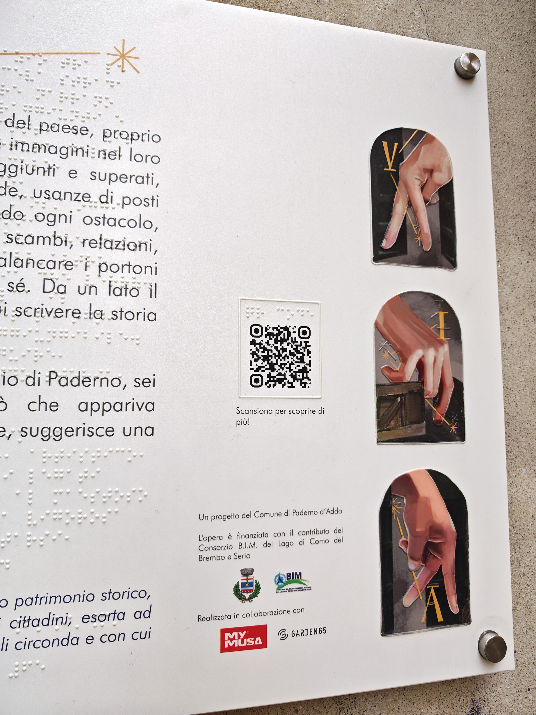 Curiosità: i tre interventi sono accompagnati da targhe tattili fruibili da normovedenti, ipovedenti e non vedenti. I testi di presentazione di VIA., TANGERE verso uno e LUCE. ACQUA. sono stati tradotti in braille, è stato poi progettato il rilievo tattile delle riproduzioni in scala delle opere.