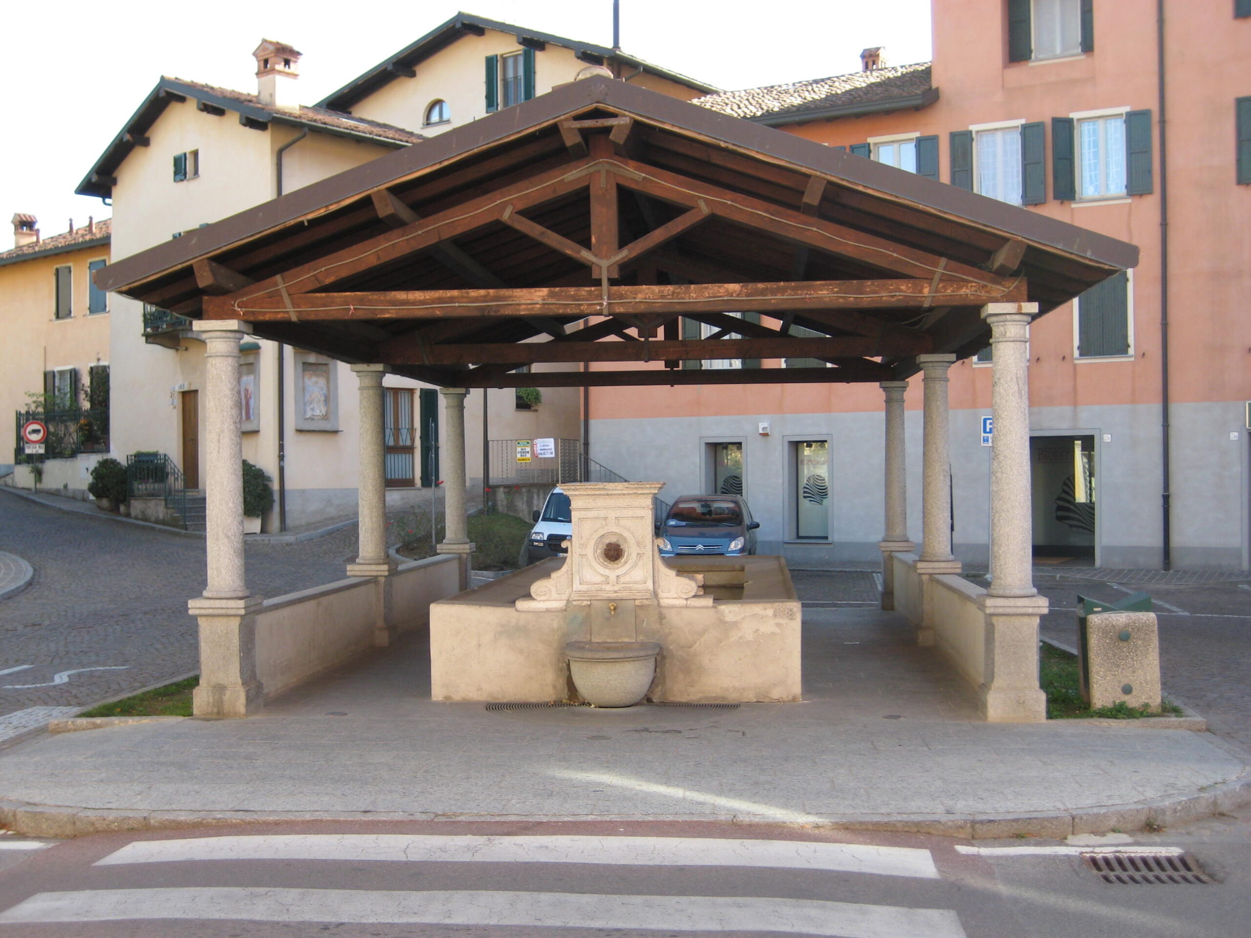 Il tetto aggiunto a capanna in legno e coppi, sorretto da colonne tuscaniche in granito, proteggeva i corridoi laterali e le vasche, rendendo il luogo fruibile anche nelle stagioni più rigide. Verso la strada, una graziosa fontana a vasca tonda con getto di acqua potabile, posta dal Comune, offriva ristoro al viandante, a conferma della funzione pubblica e accogliente di questo spazio.