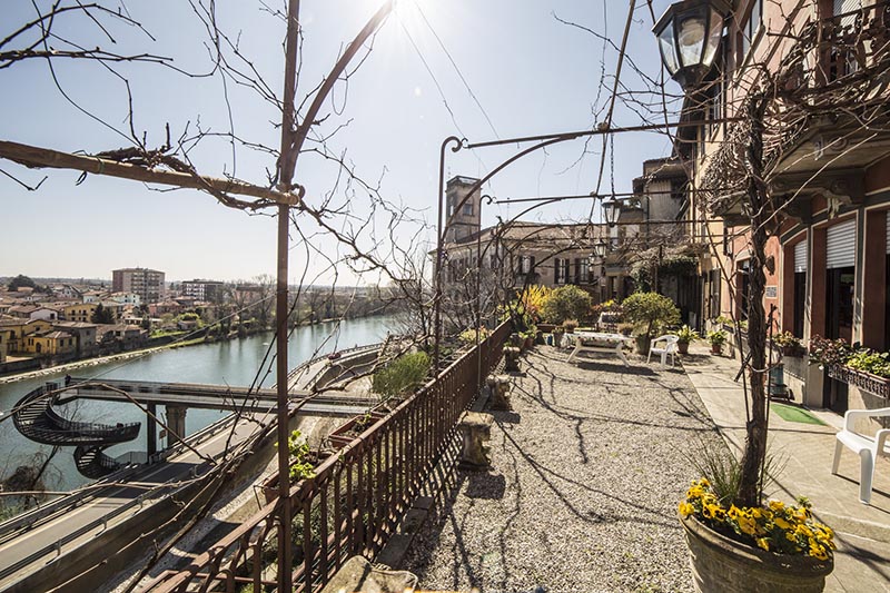Continuando lungo Via Antonio Motta, da Villa Melzi d’Eril il percorso prosegue verso nord mantenendo a destra il panorama del fiume, dove il paesaggio si arricchisce della presenza di altre tre residenze storiche di grande fascino. Tra queste, la prima a comparire è Villa Monti Robecchi. È qui che la storia intreccia le profonde radici di due famiglie che hanno lasciato impronte indelebili sul territorio: i Monti, anche proprietari dell’isola incastonata tra le acque dell’Adda e della Martesana, lì dove sorge la storica cartiera, e i Robecchi, eredi, dopo la fine della dinastia nel 1774, delle loro terre, delle loro mura ma anche della loro memoria. Nasce così Villa Monti Robecchi, un nome doppio che racconta un’unica, lunga storia di continuità e prestigio, una residenza un tempo impreziosita dai dipinti murali di Pier Filippo Mazzucchelli- noto come il Morazzone- o forse di uno dei suoi allievi, opere che ora rivivono tra le sale di Palazzo Isimbardi, a Milano. E proprio nel cuore della residenza vapriese si trova anche un ristorante più volte cambiato di nome e di gestione, talora noto come “Terrazza da Vinci”: balcone privilegiato sul fiume e sulla bellezza, luogo sospeso tra arte e paesaggio.