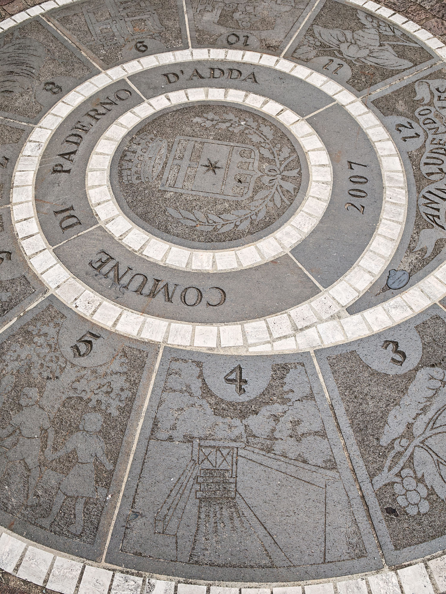 Ancora oggi, sulla destra, un grande gelso racconta la tradizione rurale di Paderno e uno dei capitoli più rilevanti dell’economia locale, fino al secondo dopoguerra, quando la concorrenza delle fibre sintetiche ne decretò la decadenza: l’allevamento del baco da seta, alimentato proprio con le foglie di piante come questa. Accanto al gelso, ormai più che secolare, un gioco disegnato a terra ripercorre la storia padernese: dalla corte rustica alla gelsibachicoltura, fino all’avvento dell'idroelettrico e del ponte, condizioni indispensabili per il decollo industriale della valle fluviale.